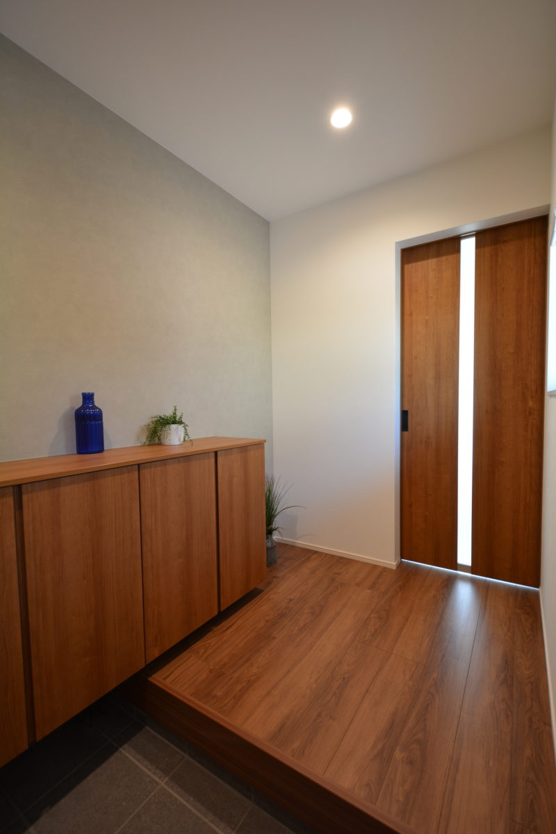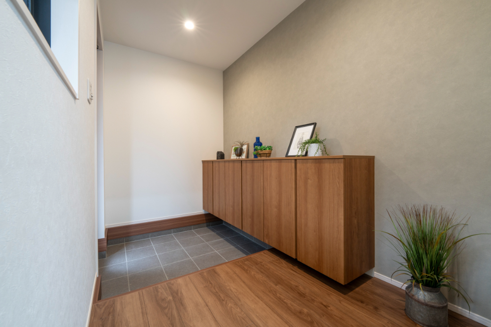 一歩足を踏み入れると、広々とゆったりした玄関スペースが広がります。 カウンタータイプの広々としたシューズボックスを完備し、家族全員分の靴もすっきりと収まる大容量の収納力を確保しました。明るく開放感あふれる空間が、住まう人とゲストを優しく迎え入れ、暮らしの質の高さを物語ります。