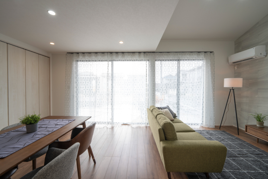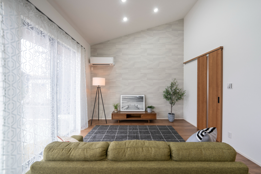 LDKの主役は、視線を上へと導く開放的な「勾配天井」です。 22帖というゆとりある面積に加え、天井高を活かした設計により、実際の面積以上の広がりを感じさせます。光が部屋全体に回り、暖かさと明るさに満たされたリビングは、家族が自然とリフレッシュできる特別な場所に仕上がりました。
