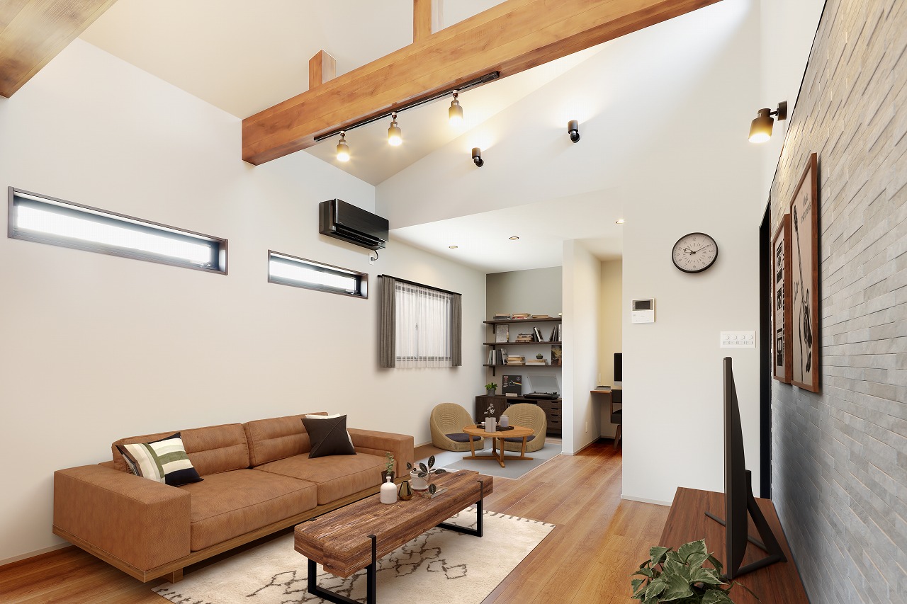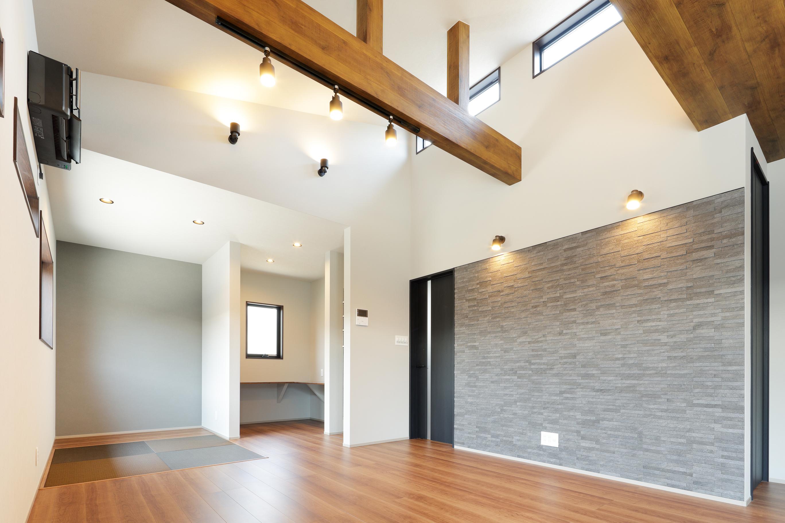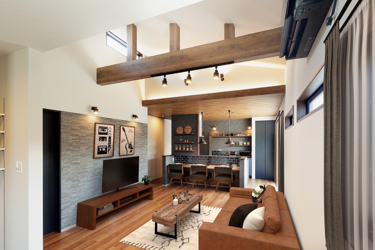 勾配天井とあえて見せる梁の相性抜群。