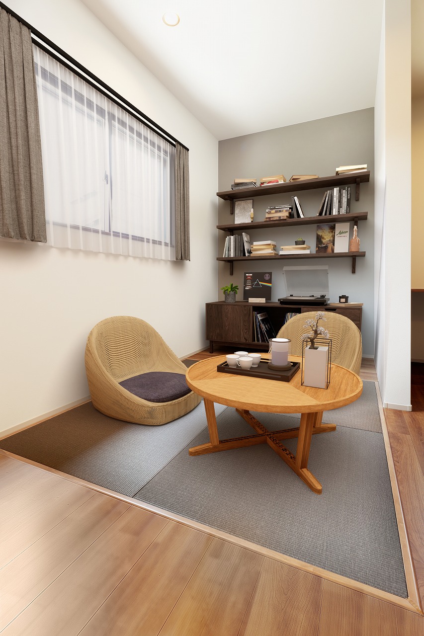 LDKの一角に畳スペース。琉球畳を採用。仏壇を置いても、くつろぐスペースにもOK。