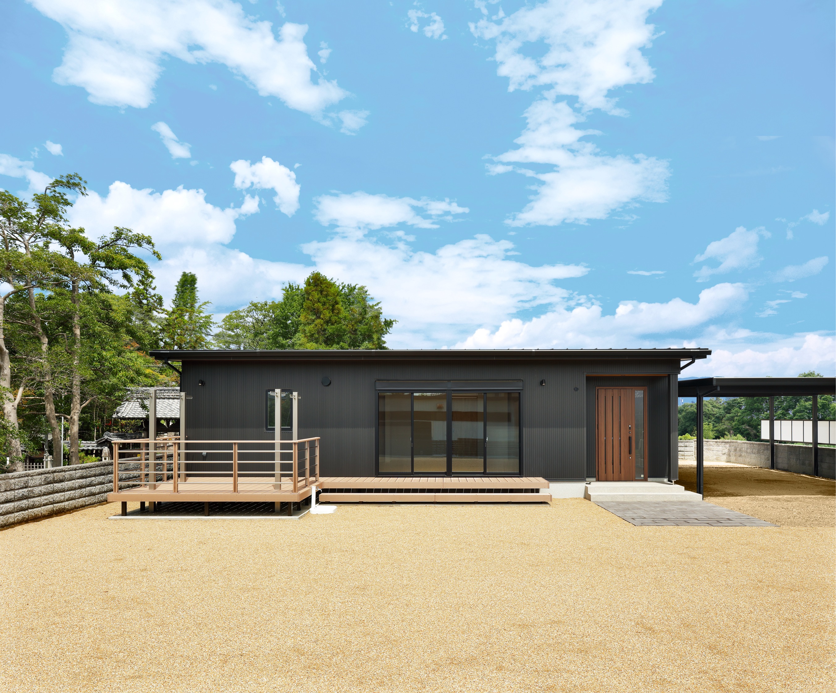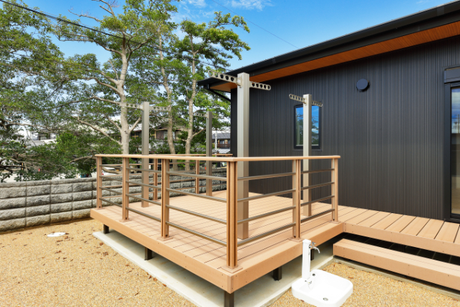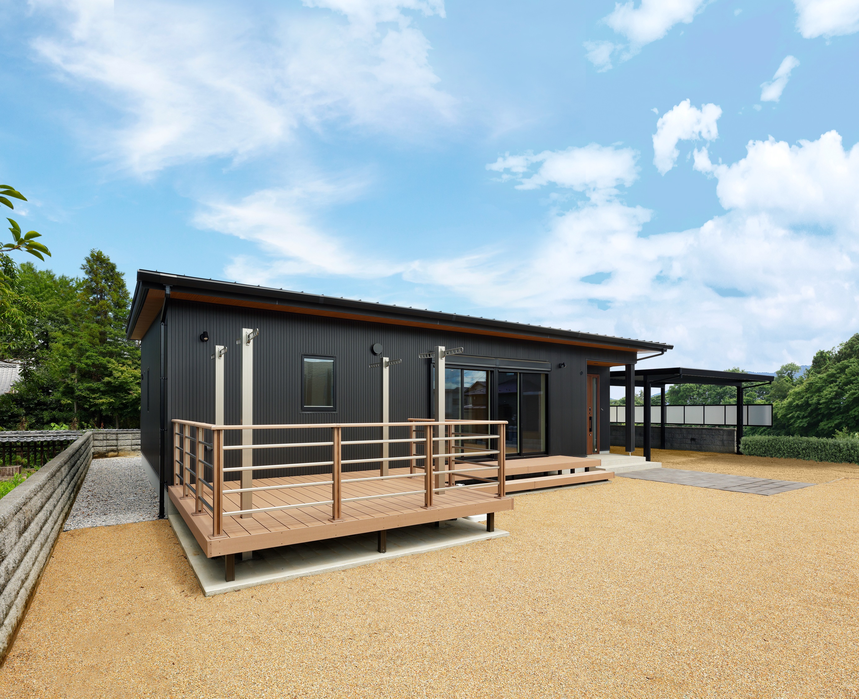 広いウッドデッキのある平屋。かっこいい黒の外観。リビングから簡単に洗濯物が干せる動線。