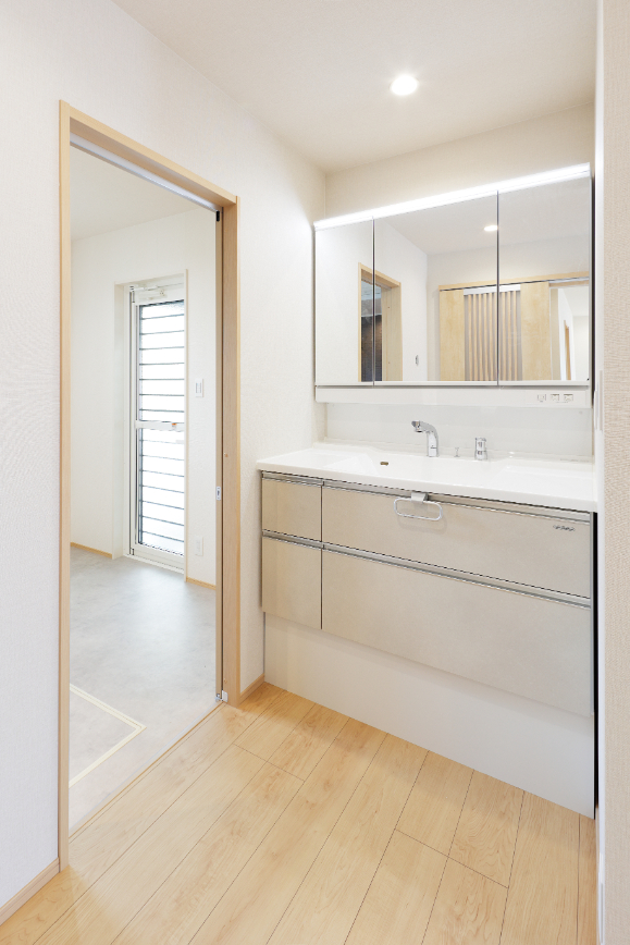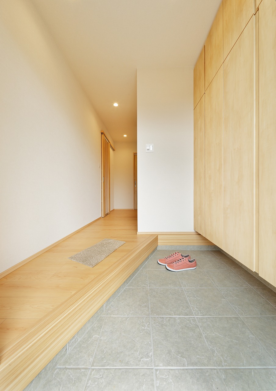 玄関の広さを有効活用した、斜めの上がり框。清掃性も高い。