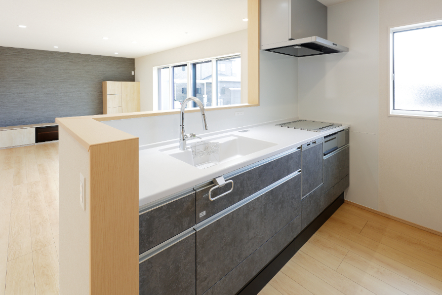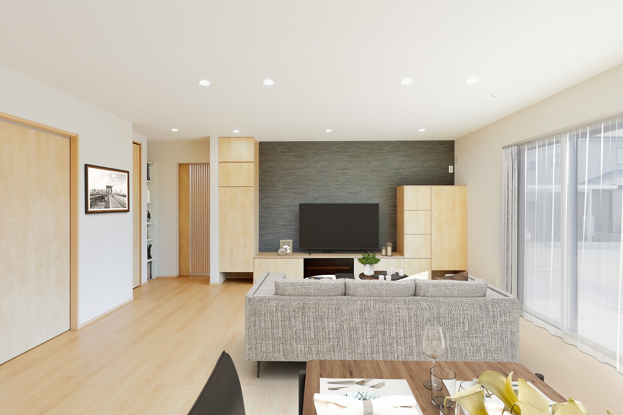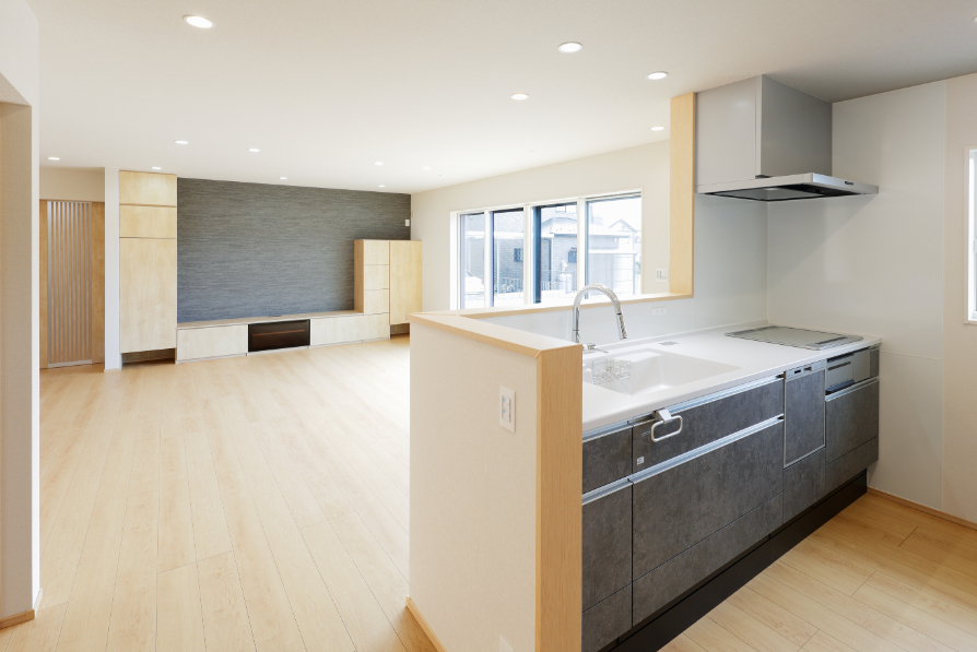 リビング側はグレーのアクセントクロスを採用。広いLDKがグッとしまってかっこいい印象に。