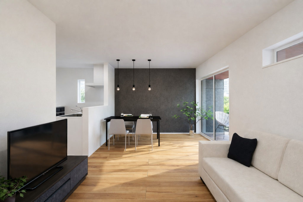 落ち着いたダークトーンの外壁と、ミニマルな窓の配置が印象的な重厚感あるモダンな外観。 流行に左右されず、時が経つほどに愛着がわく、平屋専門店ならではの洗練された佇まいです。