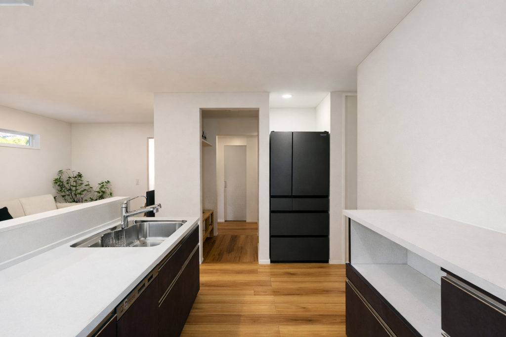 リビングから冷蔵庫が直接見えないよう、配置をひと工夫。急な来客時でも慌てて片付ける必要がなく、ダイニングをいつでもお洒落なカフェのような空間に保てます。