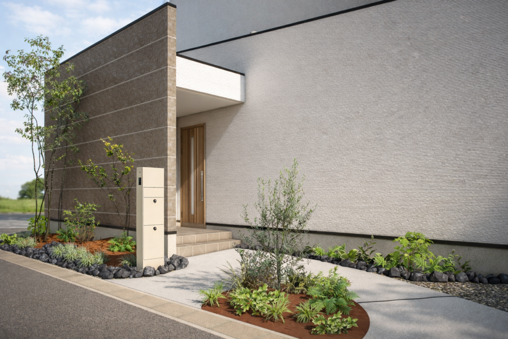 建物のフォルムに沿ってつくられた、静かなアプローチ。 外からの視線をやわらかく遮り、落ち着いて玄関へと向かえます。
