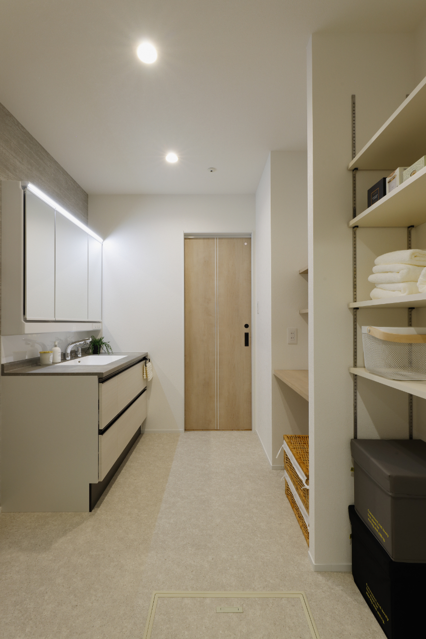 独立洗面台と造作棚で、収納と使い勝手を両立した洗面空間。