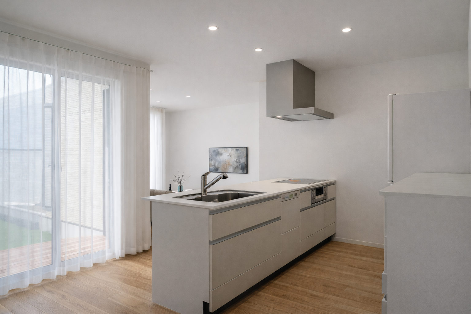キッチンとダイニングを横並びにしたことで、配膳や片付けが驚くほどスムーズに。 料理をしながらリビング全体が見渡せる、安心の設計です。 ※完成イメージ画像