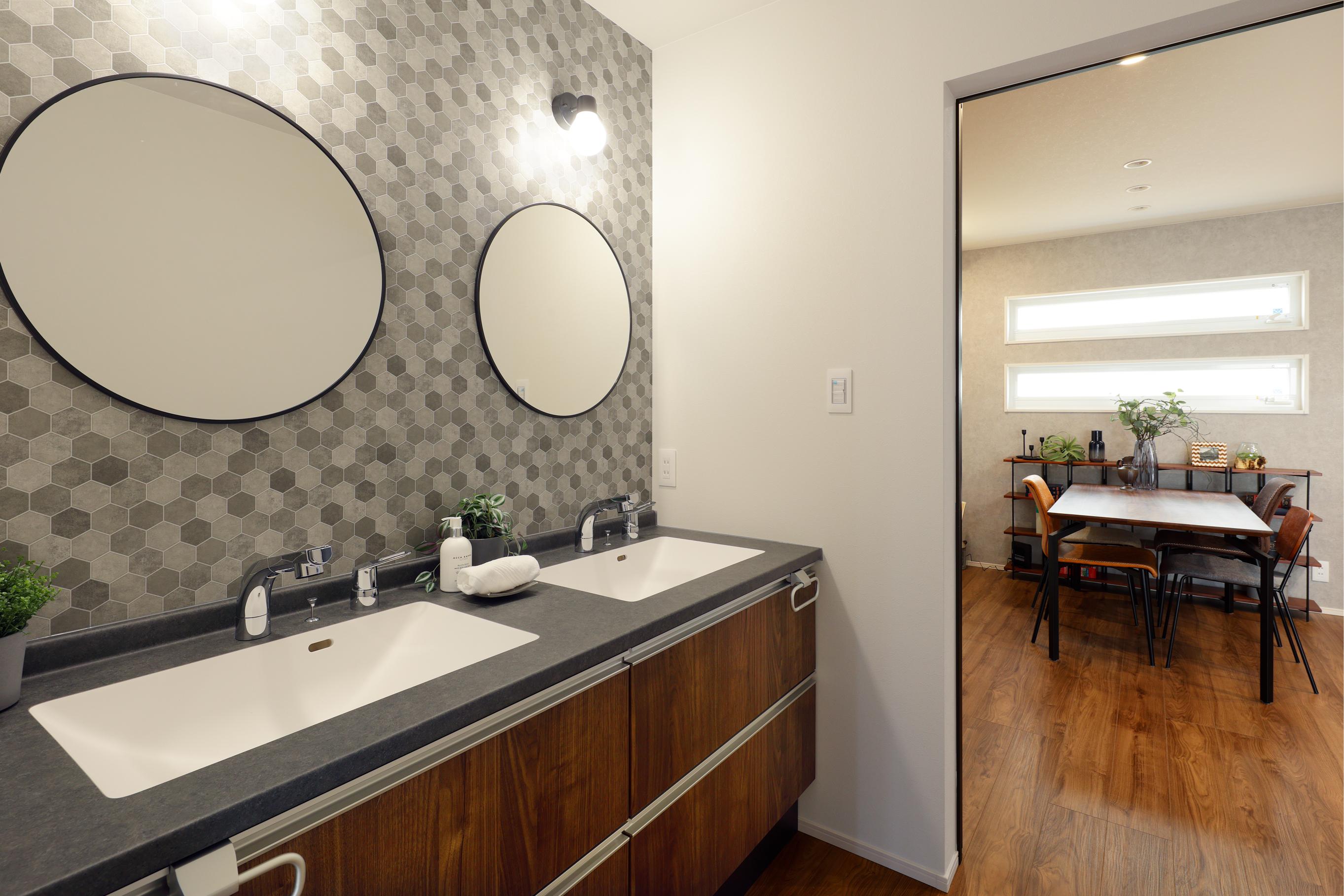 鏡の中に収納ができるタイプの洗面台が今かなり人気ですが、一緒にコンセントも隠せられるような配置だと、