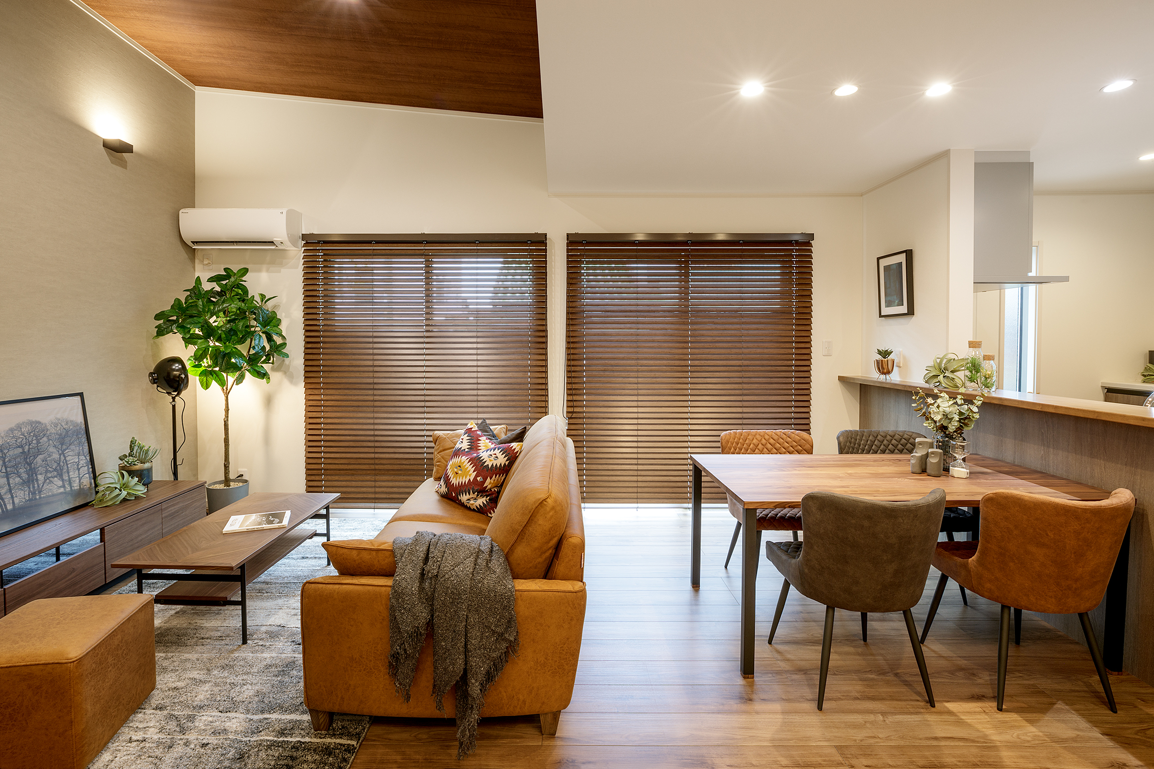 リビングの天井は、勾配天井。